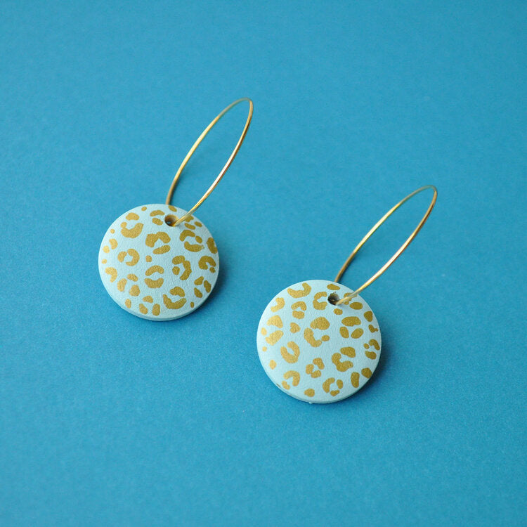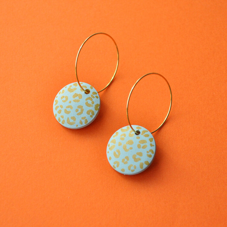 Pale sea green/blue hoop earrings with gold leopard print design, made with wooden beads. Lightweight and comfortable to wear.