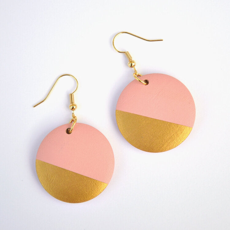 Pink and gold earrings statement earrings with geometric design, made with hand painted wooden beads. Dusty pink and metallic gold painted earrings, in a striking geometric design.